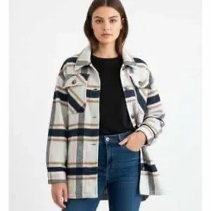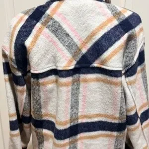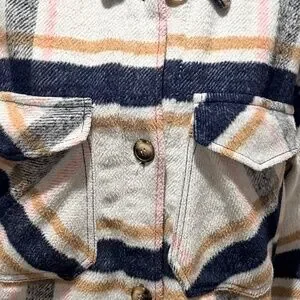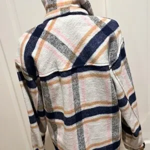 The Ashley By 26 Outerwear Plaid Shacket Jacket is a stylish and versatile mid-length jacket made from a wool blend outer shell and lining material.