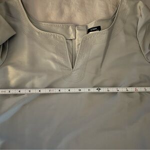 J. Crew Silver silk tunic dress with subtle embroidery on neck and wrists. Open neck with dip. 3/4 sleeves. Pockets!