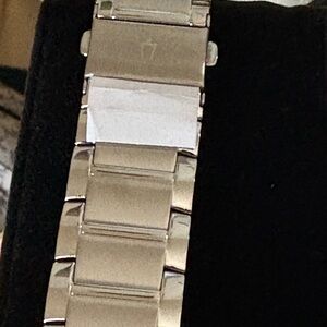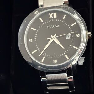 Sophisticated Bulova watch. Silver stainless steel band with black dial and date Perfect for any occasion. New in box never used may need battery due to been sitting in box
