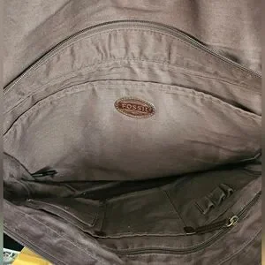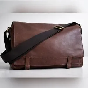 Classic Fossil brown genuine leather messenger bag featuring a soft pebbled leather exterior, adiustable canvas crossbody strap, and brass-tone hardware. Spacious interior perfect for laptop, documents, or everyday essentials.