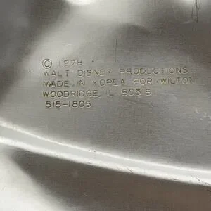 Vintage 1978 Wilton Mickey Mouse aluminum cake pan featuring Walt Disney Productions copyright. Classic character baking mold with raised Mickey detail, ideal for themed cakes or display. Authentic 1970s Disney collectible bakeware.