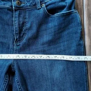 Duluth Trading Co midrise dark wash slim straight jeans. Has stretch so these can actually fit a size 10. Too loose for me (I'm a size 6/8.) Size 8 long. Excellent condition. Has a side thigh pocket and extra back pocket behind the main back right pocket.
