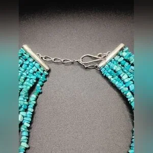 Add to your Southwestern collection with this stunning new multi-strand turquoise necklace with sterling clasp and extension. Perfect for any occasion, this piece adds a vibrant touch to your outfit.