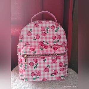 Spring is approaching, and this Pink Plaid Vegan Leather Mini Backpack with Cherry Designs, is sure to compliment any warm weather attire. It has adjustable straps, gold tone hardware, and a front pocket for holding your small items. Ships next business day.