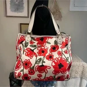 Chic Coach tote with bold red and black floral pattern. Ideal for a stylish statement. Please review all pictures as they a part of the description❤️