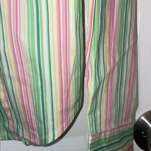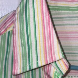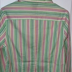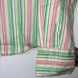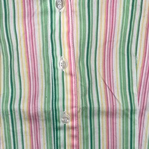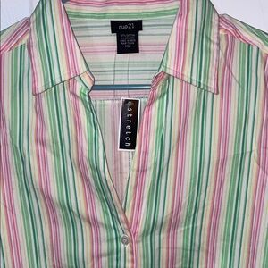 Rue 21 Long Sleeve Stretchy button-down Top with vibrant green, yellow and pink vertical stripes. This Vintage Rue 21 Offers a fitted yet flexible fit .Has 3 button cuffs and a V-neckline opening. Ideal for versatile styling. Made of cotton and spandex. Y2K