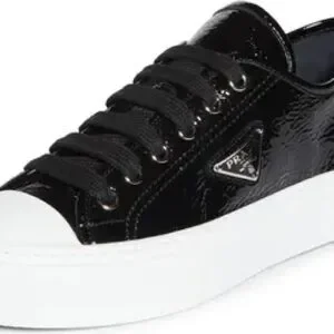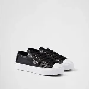 Triangle-Logo Sneakers). These low-top shoes feature glossy, crinkle-textured naplak lambskin uppers and a distinctive round rubber cap