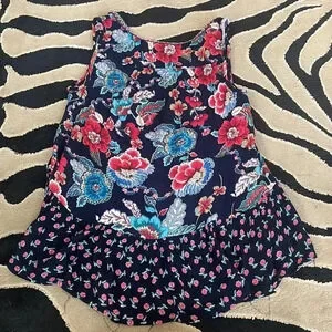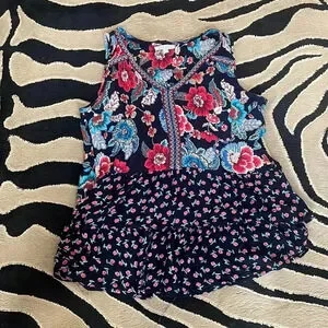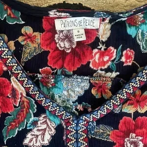 Patrons of Peace floral tank top with embroidered tribal design trim. Size small. Good condition, some threads at bottom, nothing loose.
