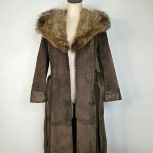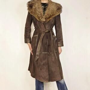 70s Real Fur Collar Suede Trench Coat Vintage Brown Long Boho Coat Winter Penny Lane Belt