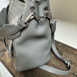 Stylish MCM shoulder bag with metallic silver and black design. Perfect for any occasion. Iconic logo pattern adds elegance.