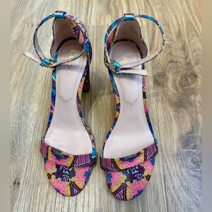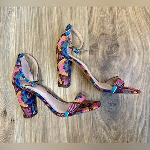 Aldo floral heels, embroidered block heel sandals, colorful ankle strap heels, tapestry print shoes, summer wedding heels, resort heels, bold print sandals, square toe heel, festival heels, statement shoes