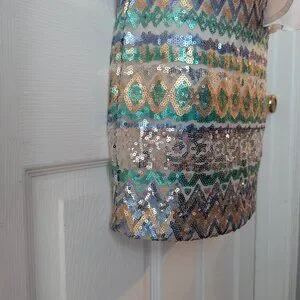 Size small mini dress with sheer top and sequined skirt in gold silver white blue and green