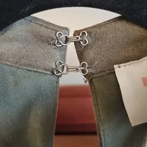Hook & eye clasp in back, may need to sew the bottom hook tighter.