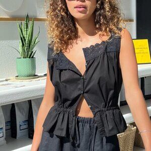A vintage-inspired blouse from Laneway The Label crafted from lightweight cotton voile. This feminine silhouette features delicate lace trim, a button front, and a softly gathered peplum waist for an effortlessly romantic look.