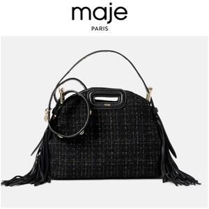 This fantastic Maje handbag features a textured black fabric with subtle metallic threading and playful tassel accents. It conveys a sophisticated yet trendy aura. Pair it with a sleek monochrome outfit to let the bag stand out as a statement accessory.