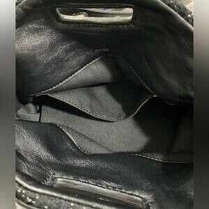 Black with metallic threading crossbody bag (Fabrication Breakdown in Last Picture). Leather Fringe detail. Gold hardware. No closure (open). Includes open pockets and a removable/adjustable crossbody strap. Dangling charm.