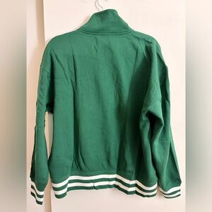 This is the popular Old Navy SoComfy line oversized half-zip sweatshirt in a vibrant green with contrasting white stripes. It's a cozy, perfect-weight fleece that's great for lounging or active wear. The design features a mock neck, functional half-zip front, and drop-shoulder sleeves for a relaxed fit