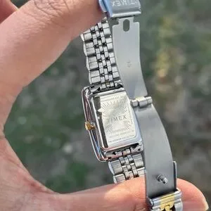 Stylish Timex watch with a rectangular face. Features a silver and gold bracelet. Ideal for any occasion.