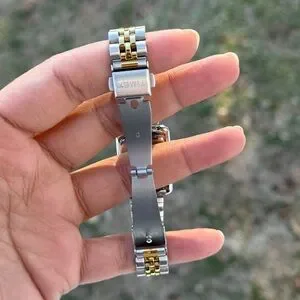 Adjustable two-tone 16mm stainless steel bracelet fits up to 7.5-inch wrist circumference