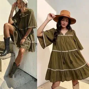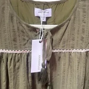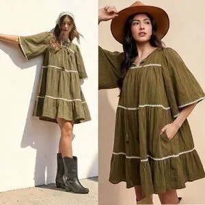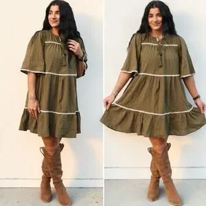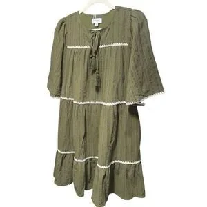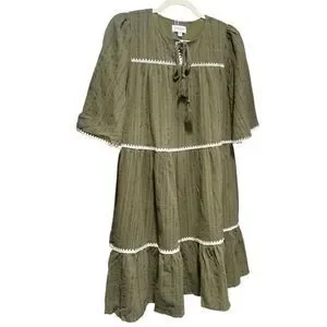 Annie Wear Olive Tiered Mini Babydoll Dress Pockets Short Sleeve NWT