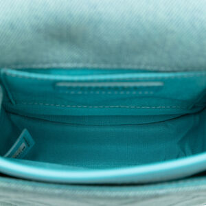 This crossbody features a quilted denim body with leather trim, a denim woven chain link strap with leather shoulder guard, a front flap with twist lock closure, and an interior slip pocket. It carries an AB condition rating.