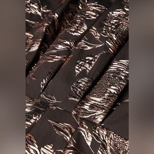 An elongated neckline and full skirt bring a '50s-inspired silhouette to this evening-out gown covered in shimmering metallic blooms.