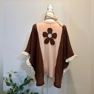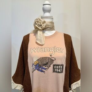 This top is the perfect mix of western and girly. The comfy fit and style is perfect for transitioning to spring and even going into summer! The sides are a very lightweight waffle knit sweater material and the center is a soft t-shirt material. This top features a distressed graphic “Wrangler” design on the front. The frilly eyelet lace and patchwork flower on the back are the perfect addition to this beautiful top. Additionally, the pockets on the front are fully functional. The top is oversized but in my opinion looks great on a variety of sizes due to the flow and lightweight nature of the fabric! It is pictured on a size small mannequin for reference. Please refer to size chart for more information! 🩷