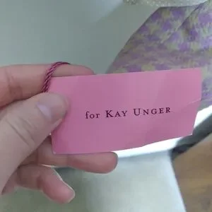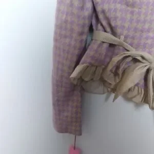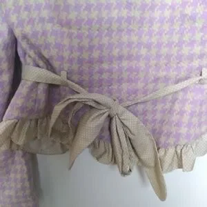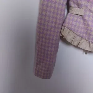 Phoebe x Kay Unger Purple and Tan Houndstooth Ruffle Trim Zip Up collared Blazer with white polka dot and ruffle trim and gold tone hardware and a ribbon tie at the back