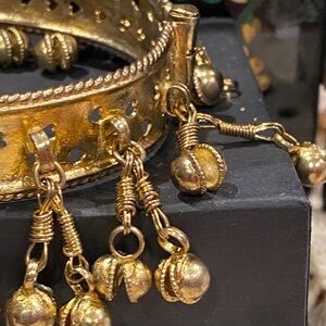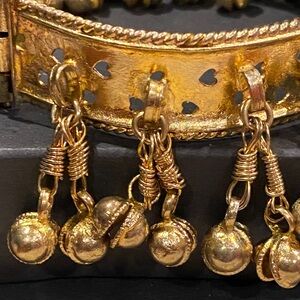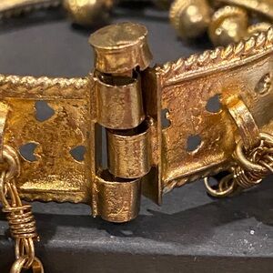 This exquisite gold tone bracelet features intricate dangling charms, perfect for adding a touch of elegance to any outfit. Vey vintage. Has a pull-up clasp. Has some wear. Not bad. A little crooked. But still beautiful