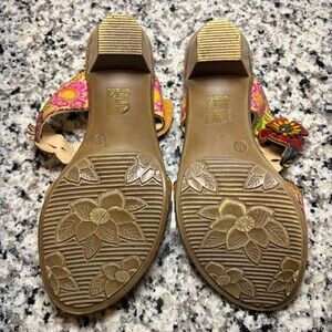 Colorful L’Artiste by Spring Step leather sandals featuring colorful floral appliqué. Genuine leather upper with cushioned footbed. Comfortable and unique boho style—perfect for spring/summer outfits or festivals.