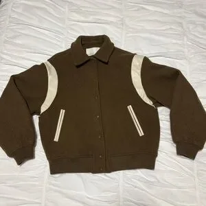 Chic varsity jacket with brown body and cream accents. Features a classic collar and button closure. Ideal for casual outings.