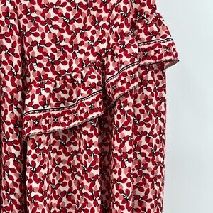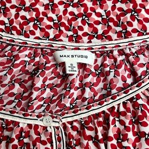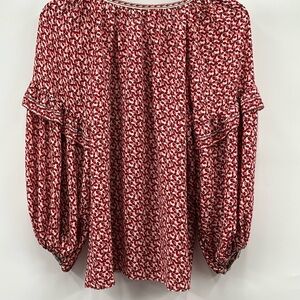 Elegant red and white blouse with a unique pattern. Features a round neckline and button detail. Perfect for casual or dressy occasions.