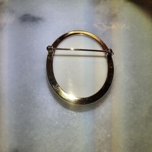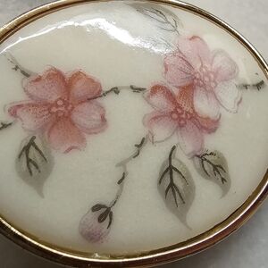 Oval Floral Pin with Gold Tone Edging, Pink Green Cream Gold Color, Pre-owned