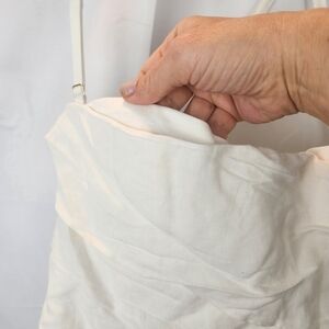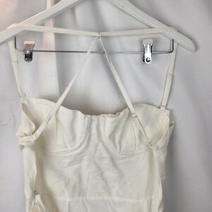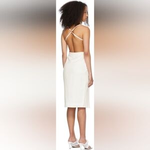 Jacquemus White 'La Robe Laurier' Dress size XL(44) BNWT Sleeveless plain woven linen and viscose-blend mid-length dress in white. Overlay at square neck collar. Darts and underwire at chest. Ruching and overlay with hook-eye fastening at waist. Vented side-seam. Zip closure at side-seam. Criss-crossing straps at open back. Full cotton poplin lining. Gold-tone hardware. Supplier color: Ecru Body: 55% linen, 45% viscose. Lining: 100% cotton. waist 34"