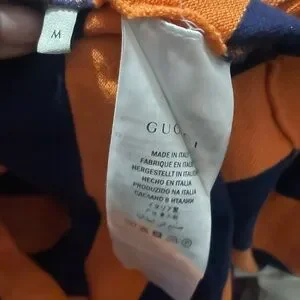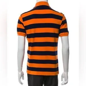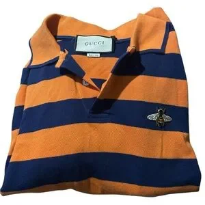 Elevate your style with this Gucci polo shirt featuring bold orange and navy stripes. Perfect for casual outings, this shirt combines luxury and comfort.