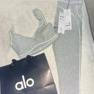 Stylish gray bra and leggings set from ALO Yoga. Soft fabric with a sleek design. Ideal for yoga and casual wear.