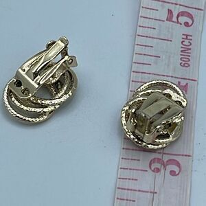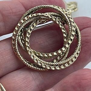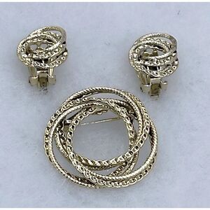 Vintage layers of rings brooch & earrings . Goldstone and 4 textured rings overlapping. One brooch and one pair clip earrings. No Hallmark.