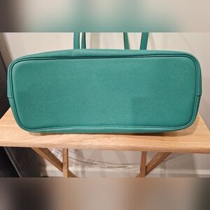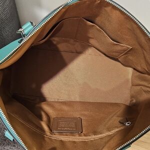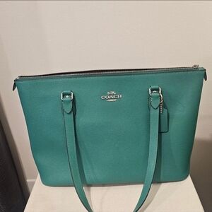 Stylish Coach crossgrain gallery tote in vibrant green/ turquoise with tanish brown interior. Sleek leather design. Ideal for daily use. Silver tone hardware. Coach leather hand tag. Excellent pre-owned Condition. Like new. No flaws.