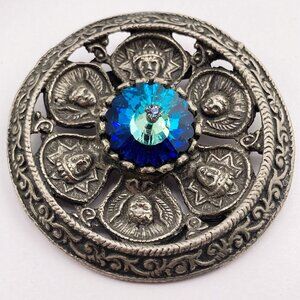 Dating to c. 1950s - 1960s, this sturdy, well-made round vintage brooch is comprised of aged pewter (or possibly pewter-plated base metal) coupled with a big blue coloured glass rivoli rhinestone in the centre of the design that is, itself, topped with a teeny little light blue rhinestone.
