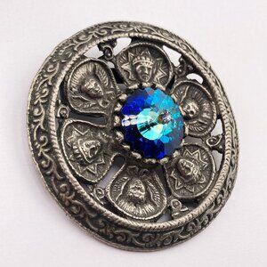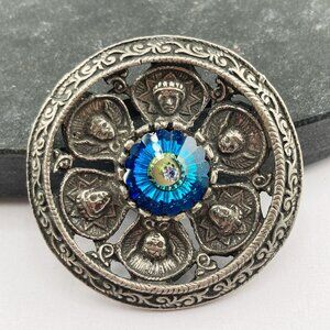 VINTAGE Aged pewter blue rhinestone brooch w/ cherub and human faces 1950s pin