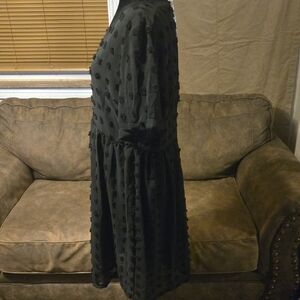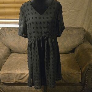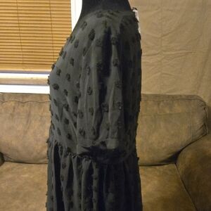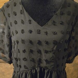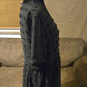 Chic black midi dress with textured pattern. Short sleeves and V-neck design with an underlining slip. Perfect for versatile styling.