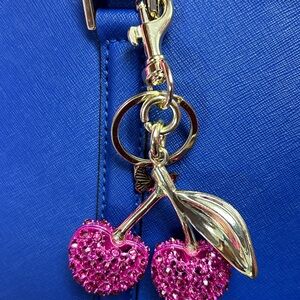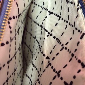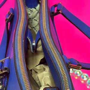 Elegant royal blue satchel by Kate Spade. Features a playful cherry charm. Perfect for adding a pop of color. The material is Saffiano leather. The double handle drop is approx. 5.5”. The interior lining is beige with a black design. There are 3 compartments inside, 2 of which close with a zipper. The middle compartment has a snap closure and has a zipper pocket. There are 4 goldtone feet on the bottom. All metal is gold-tone. Note: There WAS a call-out on one of the handles, which was minimal exposed piping, but was repaired.