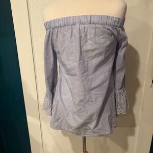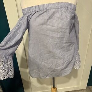 Soft off-the-shoulder blouse by BeachLunchLounge featuring classic blue and white pinstripes with elastic neckline for an easy, flattering fit. Finished with feminine eyelet lace bell cuffs for a relaxed coastal / boho feel. Lightweight and breathable—perfect for spring, summer, or vacation wear.