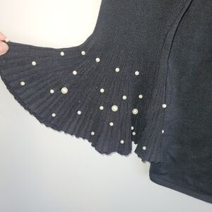 Cyrus Woman black knit sweater top featuring statement pleated bell sleeves embellished with pearl studs. Classic scoop neckline with a relaxed silhouette and dramatic flared cuffs for an elevated feminine touch.