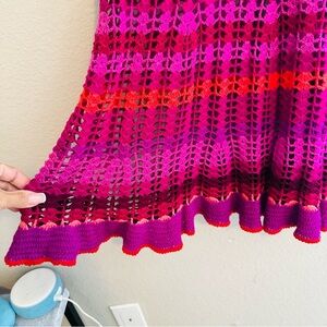 Bright crochet dress with a blend of vibrant pink, red, and purple. Ideal for a standout look.
