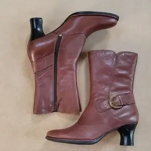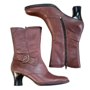 Step out in style with these elegant brown leather ankle boots. Perfect for any occasion, these boots feature a sleek design and a comfortable fit. The rich brown color adds a touch of sophistication to your outfit. ~8" boot, 3" heel. Size 6.5 EUC no box