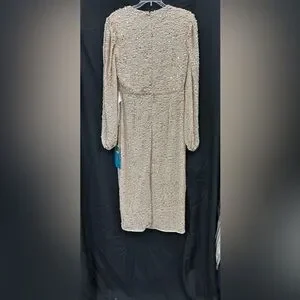 Mac Duggal 10764 NWT SEQUINED ILLUSION PUFF SLEEVE V NECK MIDI DRESS