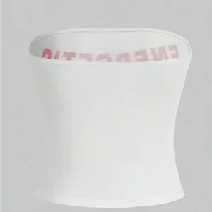 White tube top with bold red graphic design. Features energetic text and artistic images.