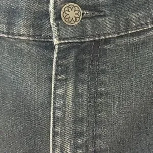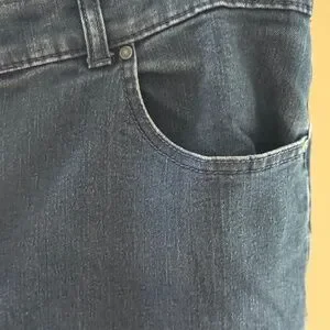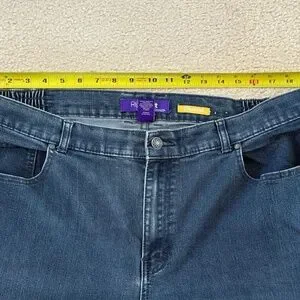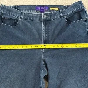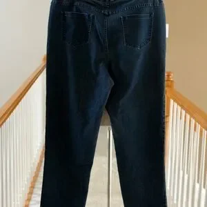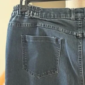 Pair of women's plus jeans from Right Fit by Catherine's. They are straight leg jeans in size 18W. Elastic stretch on each side at waist. Material is 72% cotton, 27% poly and 1% spandex. Zipper with top button closure. Made in China. In good condition.