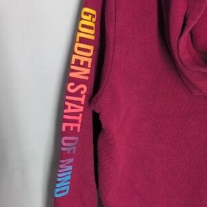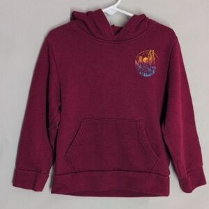 Maroon hoodie with a colorful sleeve print. Includes a cozy hood and front pocket.
